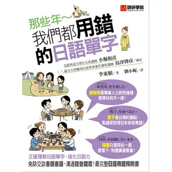 事實上,學習日語不可以只是一味地去背誦單字,而應該確實地去了解,何況日語有很多漢字跟中文很像但不見得用法一樣,「中日學習」也可謂是舉世少有,極為容易誤解的學習,所以,在學習日文時,對於在什麼樣地情境,日本人會使用什麼樣的字彙這件事應該更留意、小心。在本書中,作者李老師挑出150多組讓日本人有聽沒有懂的日語單字表現,加上易錯的比對或是個別的說明,從台灣及日本之間的語言文化差異角度告訴你,在這些讓人啼笑皆非的誤會之中,到底是哪裡出了問題!